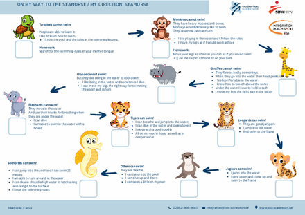 Wir freuen uns, den gemeinsam mit der DLRG entwickelten Flyer "Mein Weg zum Seepferdchen" vorzustellen. Dieser speziell entwickelte Flyer begleitet Eltern und Kinder mit verschiedenen Tieren auf dem Weg zum Seepferdchen-Abzeichen und bietet ihnen eine Übersicht über den Fortschritt und den Stand der Schwimmfähigkeiten der Kinder. Dieser Flyer wird ab sofort in all unseren Seepferdchen-Kursen ausgegeben und soll Eltern dabei unterstützen, die Entwicklung ihres Kindes im Wasser gezielt nachzuvollziehen und zu fördern.